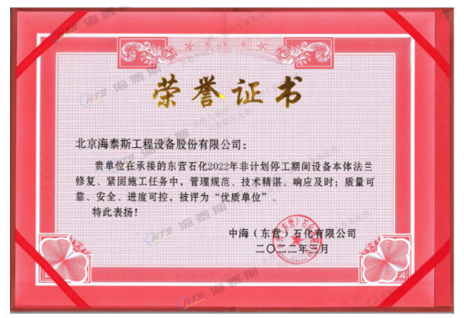 海泰斯獲評(píng)“優(yōu)質(zhì)單位”!負(fù)責(zé)的催化裝置、常減壓裝置泄漏法蘭的在線修復(fù)和定力矩緊固施工任務(wù),實(shí)現(xiàn)了“零泄漏”的目標(biāo)。